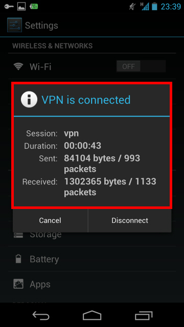 连接设置旁,安卓的状态指示区将显示 "VPN activated"