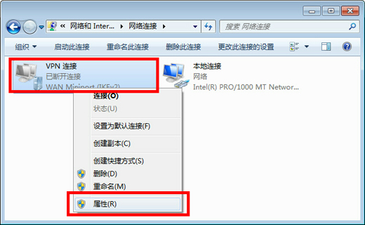 当前定义的 VPN 连接设置被列出来了。右击你在上一步创建的图标,并点击 "属性"